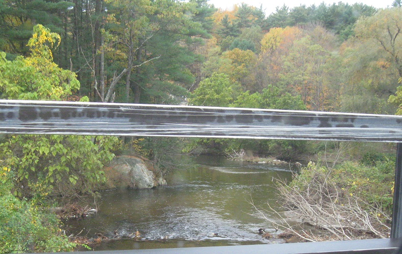 Main St. stays straight while Mill River snakes under it 3 times. I don't know which bridge is the weight-restricted one, but the old concrete arch (southernmost of the three) is a reasonable guess. The first photo looks west from the northernmost bridge.