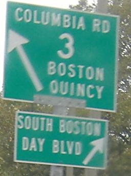 Signage at the rotary, where there is in fact another exit to Day Boulevard (for traffic that wasn't on Morrissey already). Why do these point to MA 3? When these signs were erected, it was obviously before 1990 (since shields replaced numbers by then), so US 1 was not on the JFK Expressway. If it was much before 1980, which is probable, then I-93 had not yet been extended this far. MA 3 was supposed to end at I-95 where I-93 Exit 16 (Melnea Cass Blvd.) now lies, and I-93 began out of nothing north of Boston until I-95 was killed. As an interesting side note, if one proceeds west on Columbia Road to "3", all the new LGS's at that interchange point only to I-93 and US 1. Click the first photo for clearer, closer versions of the LGS's at left (after the STATE POLICE sign has been removed).