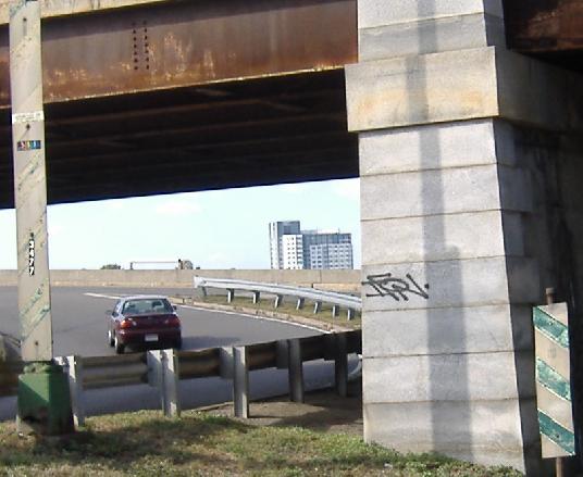 Old slash warning strips, with the NB ramp to Storrow Drive WB on the left and the ramp to EB (i.e. continuing old US 1 NB) on the right. The aging sign is on the WB ramp, and that merging traffic is from Commonwealth Ave. and the rest of Back Bay.