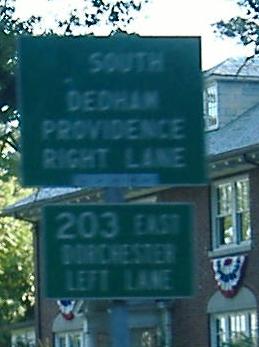 Signs of US 1 heading north as the VFW Parkway rolls on toward Boston. The last sign is in the MA 203/former US 1 rotary.