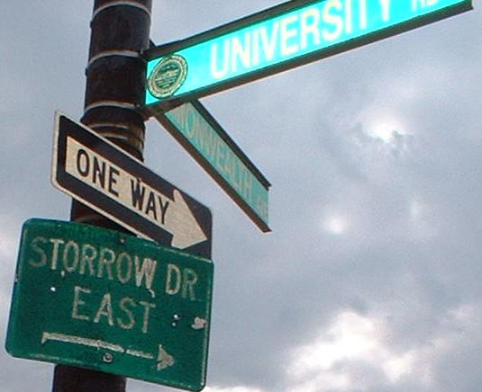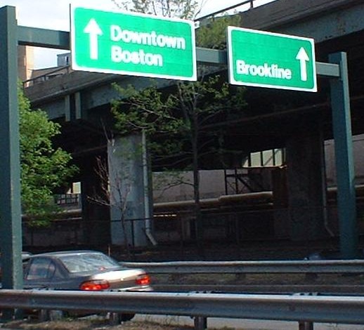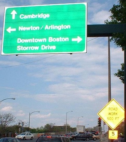 WB signage at the BU exit - the straight arrows are misleading, as the actual exit requires a 5-10 MPH right-hand turn onto University Road. As you can see, the end of that road retains the old Storrow Drive LGS.