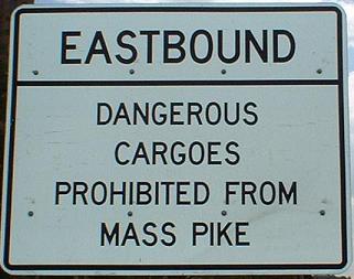 OK, who failed glue in kindergarten? The akimbo I-90 shields on Cambridge Street (there's one on the back of this one facing SB traffic) suggest someone spent his time eating glue instead. I think the dangerous cargo signs are cool; hazmats exit here at Exit 18 from the Mass Pike, follow River Avenue into the heart of Cambridge, then follow Mass. Ave. (MA 2A) to Main Street, and along several more streets than that as well.