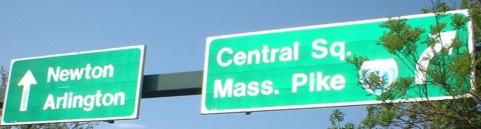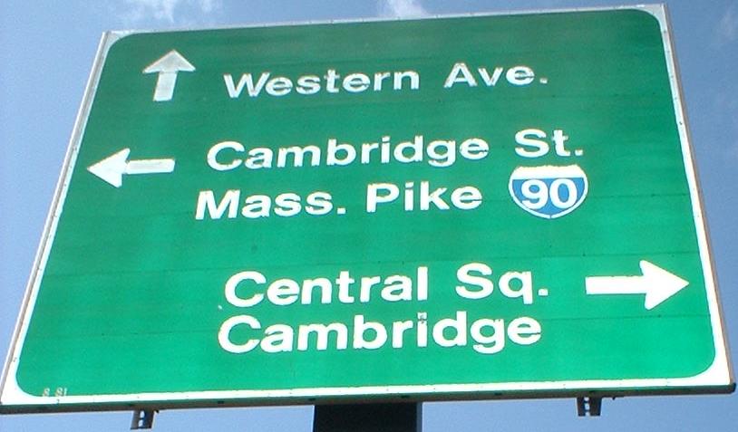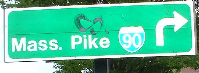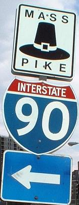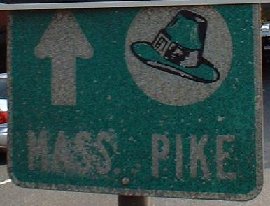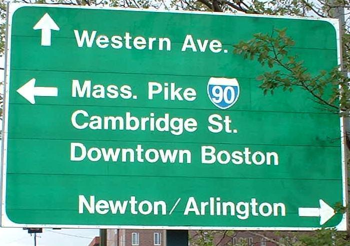 In order to get to the Mass. Pike, you have to get off at the Western Avenue exit and follow a few surface roads. The signage is good, though, as people coming out of Boston tend to use Storrow as much as the Pike. This sign is probably a little newer than the one at Western Avenue (keep reading).