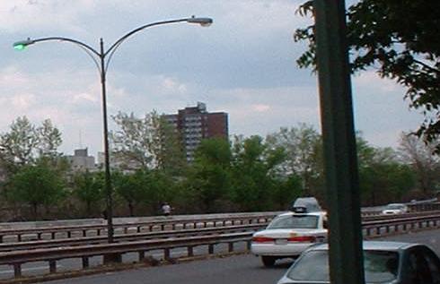Looking west along Storrow from the BU Bridge, with I-90 in the distance. I-90 was meant to run along the path of Storrow, with Storrow relocated on top of the Charles River (just like Memorial Drive at the Longfellow Bridge), but the park advocates won (the Drive is really more like a Parkway), and so I-90 now runs above the Allston rail yards. In the foreground you may see a tree growing on the railroad bridge. Yes, in fact, you're right; until the 1960's or '70's there were two tracks here, but one was taken out of service, rails and ties removed, and left to nature and graffiti artists. The other is still used for shuttling MBTA cars, as it's the only Boston-area connection between North and South Stations.