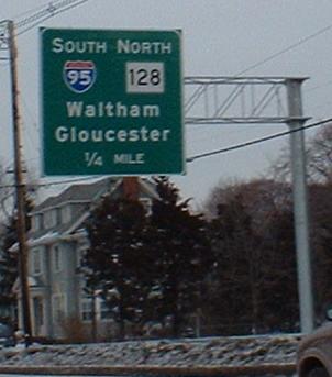 Traffic to the Circumferential Loop from US 1 must use the service road to access the exit. Most of the signs are new, and don't show MA 128 to the south, which is odd because it still multiplexes with I-95 down to I-93 by Quincy. The old sign, however, shows 128 as continuing along I-95; the sign is old enough to predate MA's practice of putting button-copy into Interstate shields. Anyway, this sign is incorrect. Technically, I-95 continues to the north for one more exit before leaving, so when you take the NB 128 exit you're actually just following NB 95 to get there. Why isn't I-95 NB signed here? It makes much more sense for traffic to continue straight on US 1, through one traffic light, and onto I-95 at Exit 46, which is where the northern freeway section began until it was decided to just bring it in to MA 128 and forget about the rest of the Northeast Expressway.