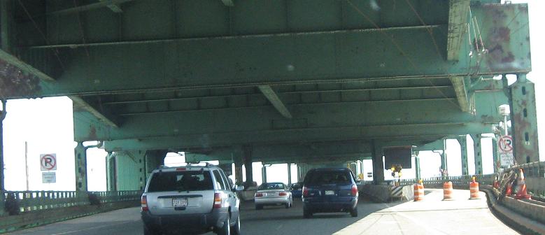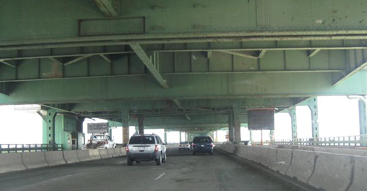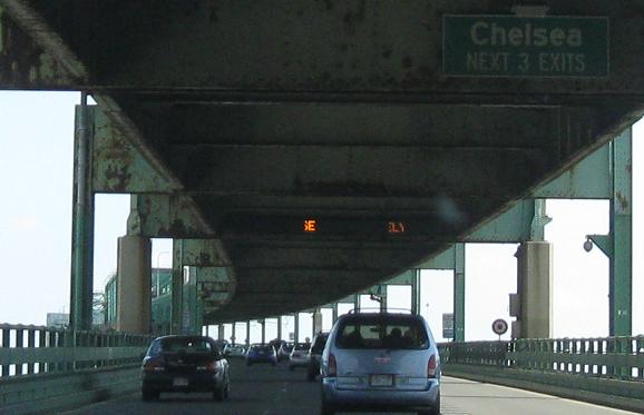 A faraway shot (from Chelsea) of the SB entrance to the top of the bridge and warning of the upcoming toll that still sits on that level in midspan. The Tobin Bridge and the Triboro Bridge are the only two I know of with tolls on the spans instead of on land - but even the Triboro Bridge's two tollbooths are on an island.