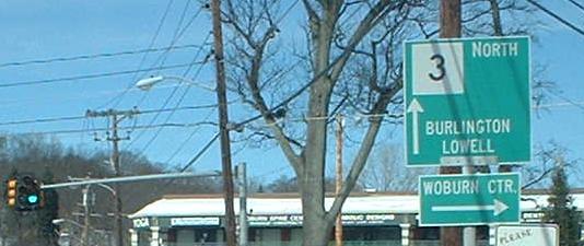 MA 3 ended awhile ago. These are in Lexington (or just northeast of it), the first on US 3 NB and the second on Russell St. WB (same intersection), shortly before US 3 becomes MA 3A and the US route jogs over to the Northwest Freeway. Whoever made these LGS's probably made the assembly slightly to the north: