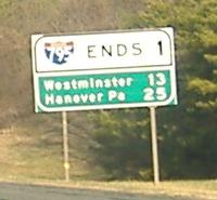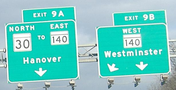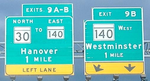 Northbound at the last exit and end of the route. MD 795 continues the number north until MD 128 begins, even though that number is already in use (secretly) elsewhere in the state. (Both 795s are secret, so why not change one? Who would know?) In the first photo, besides the 140 shield on the left being too small, the sign on the right is too small (as is the "WEST"). In the second photo is a unique way to sign the end of the route (via a distance sign). Skipping the third photo (create your own reason!), joining auxiliary plates with route shields on a black background is typical MDSHA (State Highway Authority).