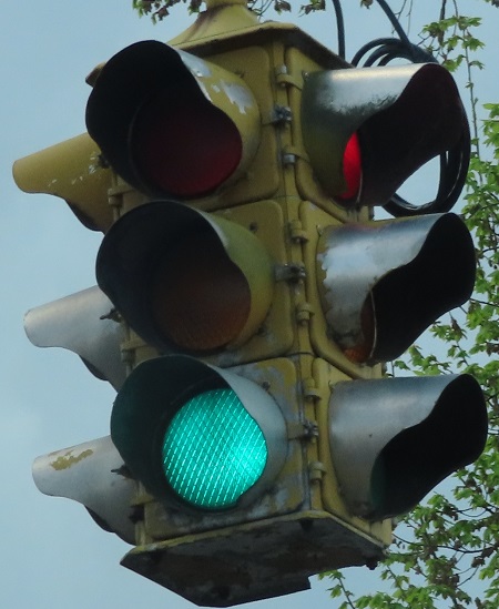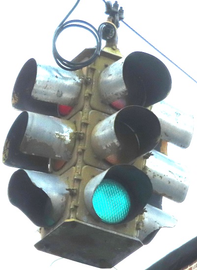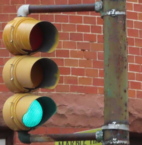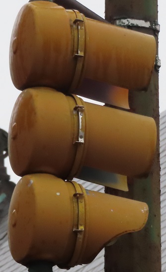 Rounded signals are a rare specimen. As are signals facing SB traffic on a NB one-way street. Unsurprisingly, this McMechen St. example is for pedestrians.
