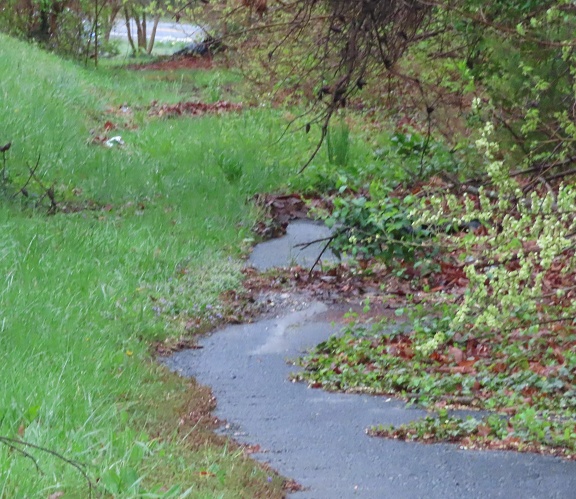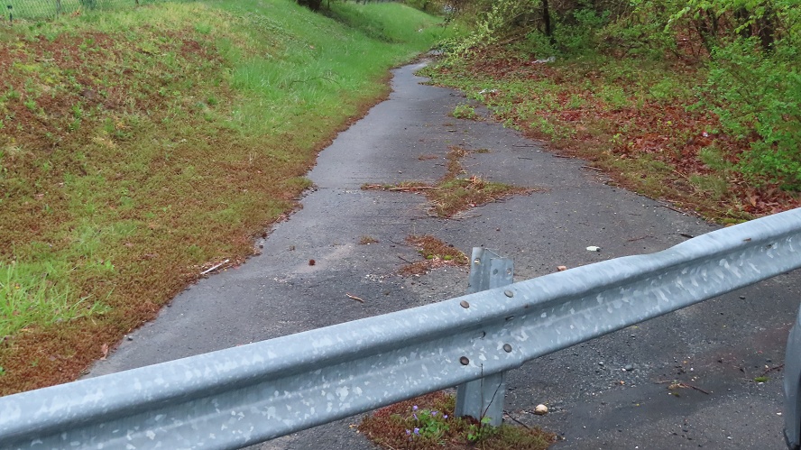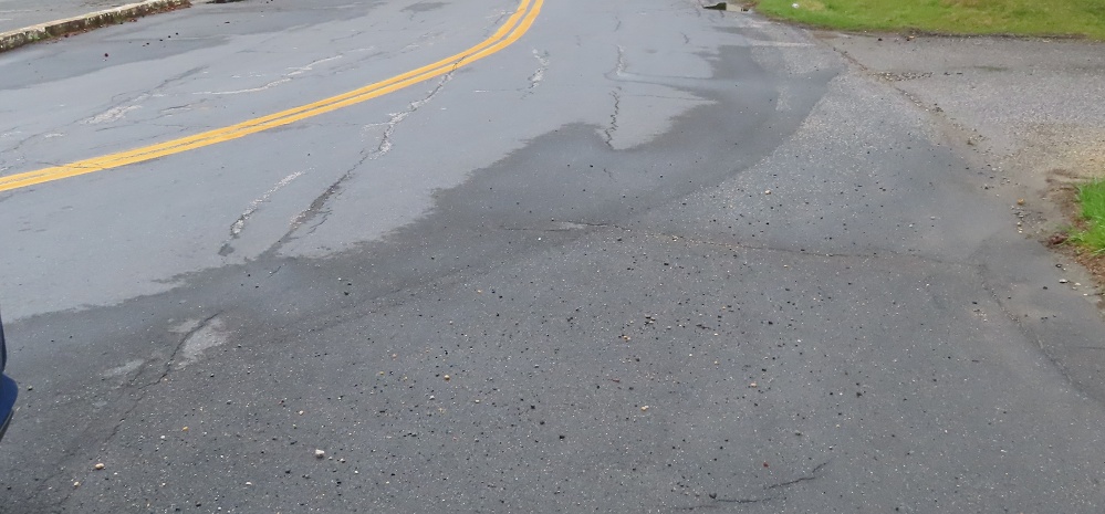 Looking north from the stub, you can see the old concrete pavement cracking the asphalt as Old Mountain Road merges onto it. McGuigan Dr. is to the right.