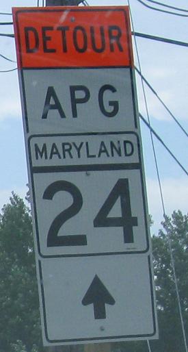 I ran into a few of these signs in the area right by Aberdeen Proving Grounds (APG, imagine that) at the south ends of both MD 152 and MD 24. This sign is SB at Hanson Rd., and you can see that it's actually all one sign in back with an MD 24 shield pasted on top.
