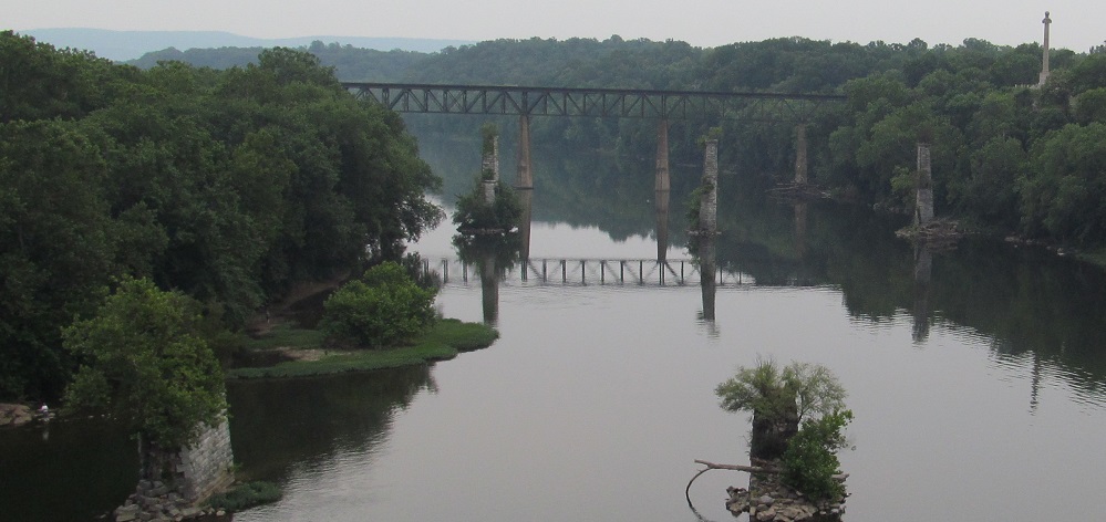 As I cross the Potomac River into Maryland, several interesting piers rear their heads to the southeast. The closest set of abandoned piers belonged to the original road bridge, which once connected into Princess St. on the WV side. I know route numbers have changed, but essentially, MD 34 connected into WV 230 instead of WV 480. The farthest set of piers, the only ones with a bridge on top, are for the Shepherdstown Railroad Bridge (Norfolk Southern now, once Norfolk & Western). That leaves the middle piers, and I have no answers because they predate the oldest map I've found (1914). They could have been for an even older road or rail bridge, or some sort of aqueduct or other feeder into an old mill (Mill St. is right there).