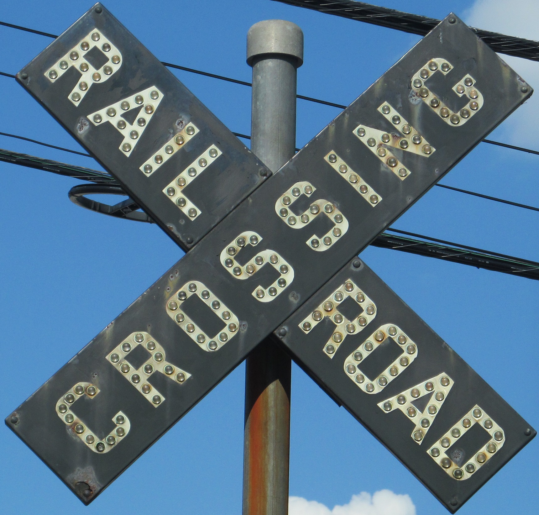 Easily visible from MD 648, these reverse-color button copy crossbucks are on Riggs Rd., WB and EB in Severna Park just west of 648. Click on the second photo for a closeup.