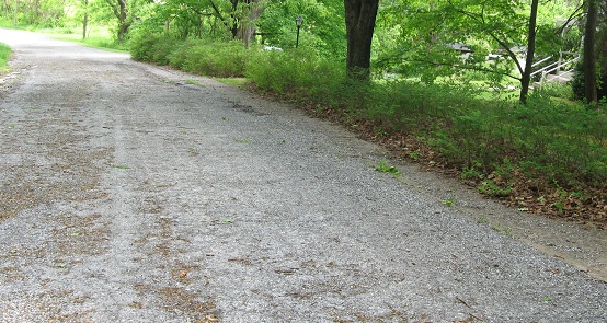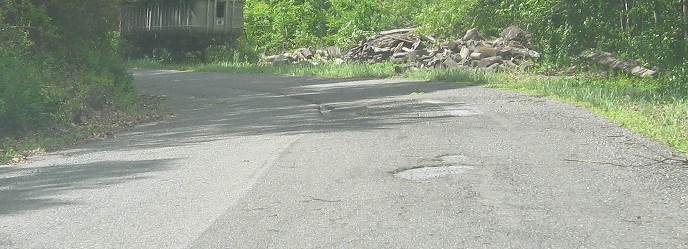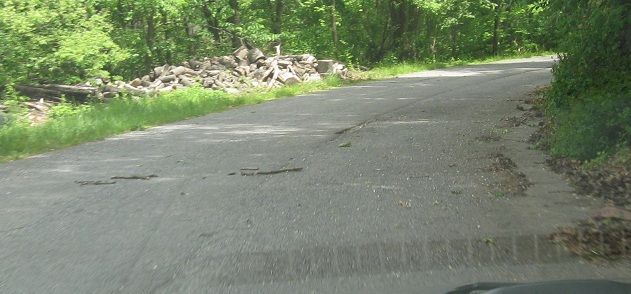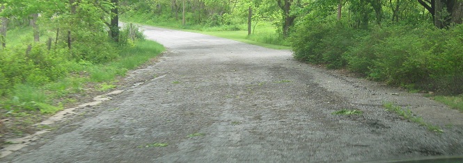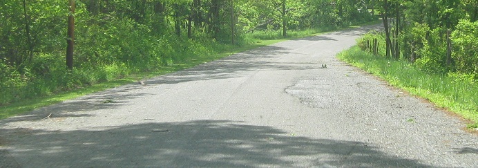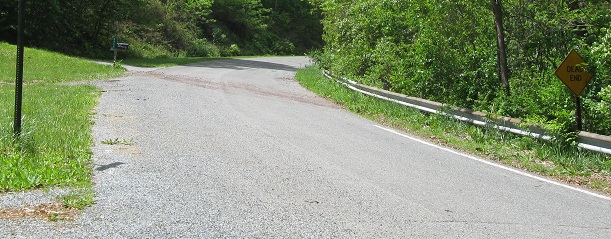 Scenic US 40 follows the original National Road alignment as much as possible, but Western Pike deviates from Scenic US 40 on the east side of Sideling Hill after a rather uneventful hairpin crossing. The slope down to this dead-end road was too steep for a modern highway, so it has been bypassed to the north. These photos head west from Exline Rd., where Western Pike is no longer just an exurban residential street, until further traffic is barred. The pavement then curls left from here and comes up toward the current alignment after a couple of bends. In hindsight, I should have gotten out and hiked a bit.