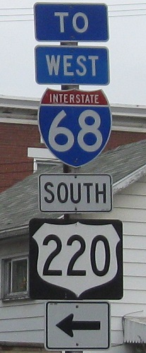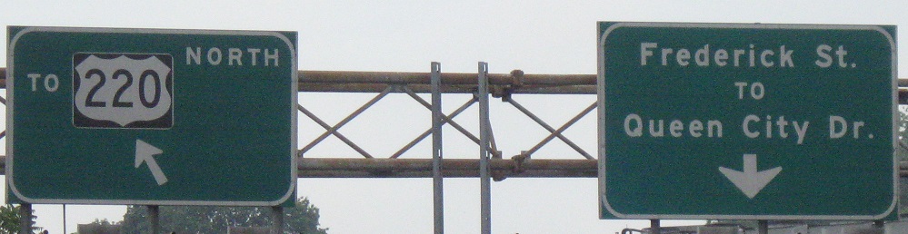 Questionably old, but it's rare to see a BGS in the middle of a small city, particularly in a place where there are no highways and little traffic. This is on Frederick St. NB, and the way to US 220 is via the old highway - at low speed, through a miles-long residential area on a long, steady upgrade. So maybe the best way to US 220 NB is to bear left (railroad overpass) but then make the next right and cut over to I-68.