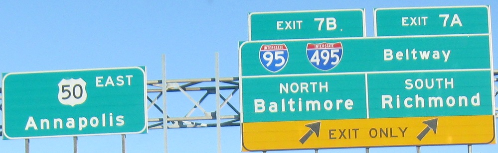 In both directions in the vicinity of I-95, pull-through BGS's have a little extra space, and that space would be for I-595. US 50 actually is secretly I-595, but it isn't signed because US 50 and US 301 (once they come together) take up enough room on BGS's, and the road has been known as 50 anyway.