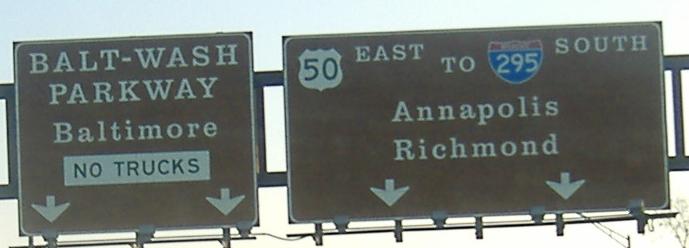 Technically, the Baltimore-Washington Parkway begins at the DC/MD line on US 50, and then exits onto the through route that can generally be called 295. What I just called "295" starts life as I-295, then becomes DC 295 when I-295 exits over the 11th St. Bridge. When it hits the state line, DC 295 becomes MD 201, which leaves the freeway at US 50 to become Kenilworth Ave. At that point, the freeway becomes just the B-W Parkway, although Maryland pretends it's MD 295. Finally, once the Parkway ends it's officially MD 295 and signed as such. The I-295 shield here should really be a DC 295 shield, even if that road does eventually lead to the Interstate.