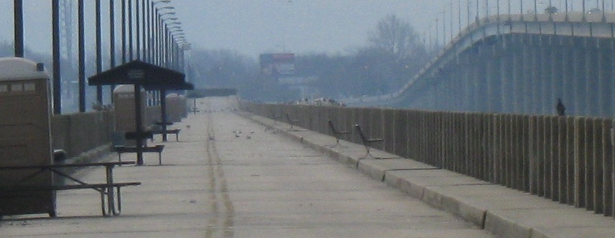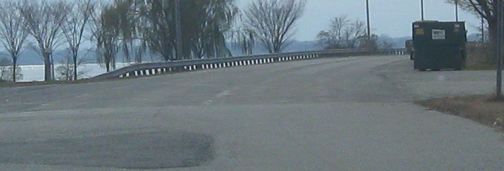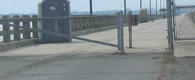 Walking out onto the "pier," which is still striped like a road, and looking at the relatively good condition of the bridge structure (especially compared to other closed bridges I've photographed), then heading back west to the car. Considering the bridge was removed from service in 1987 and dates to 1935, it's aged remarkably well.
