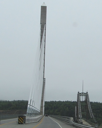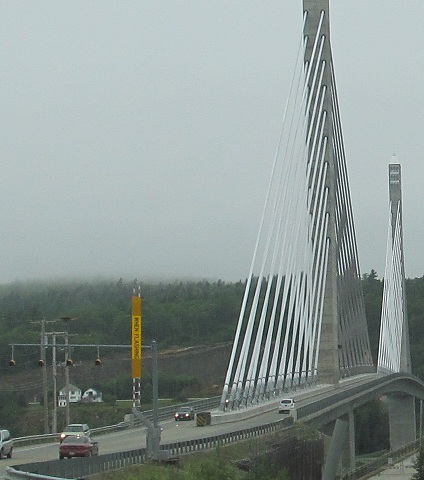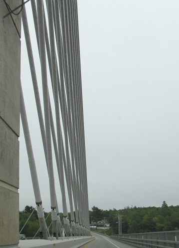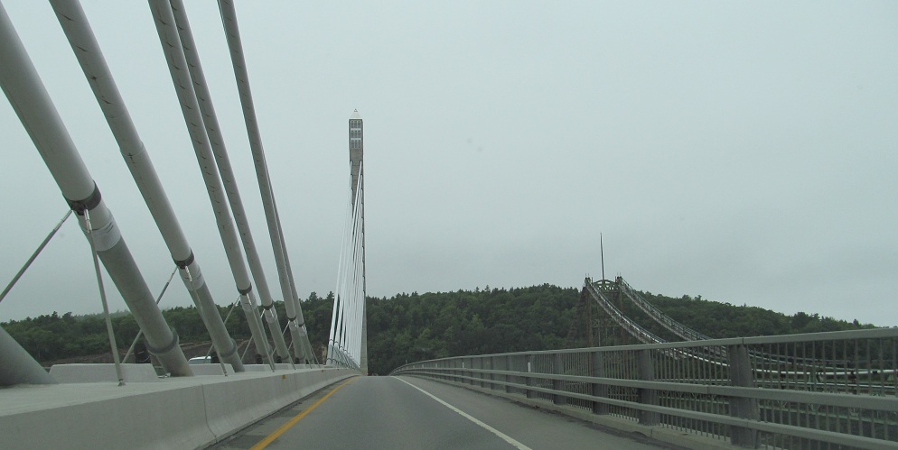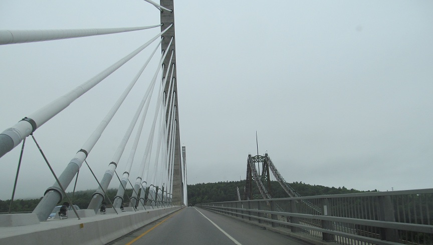 Across the Penobscot Narrows Bridge, with looks at the old bridge to the north and the Narrows to the south.