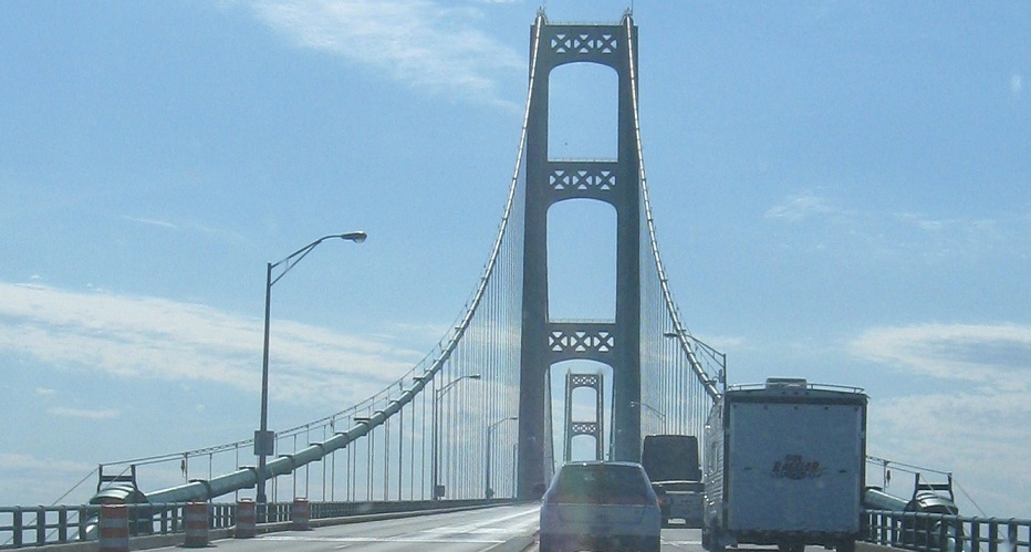 By day, but from above, I-75 NB on the Sault Bridge leading up to the border.
