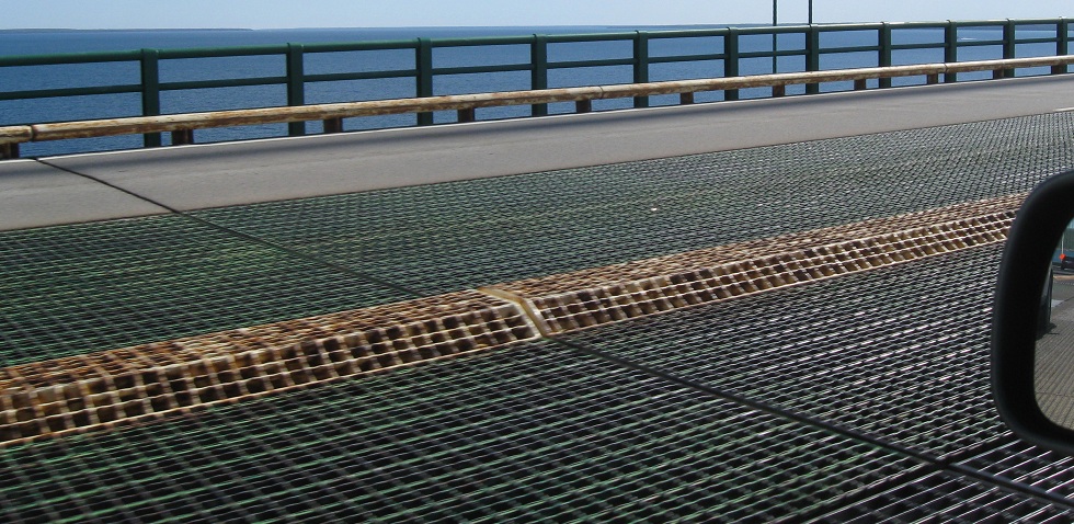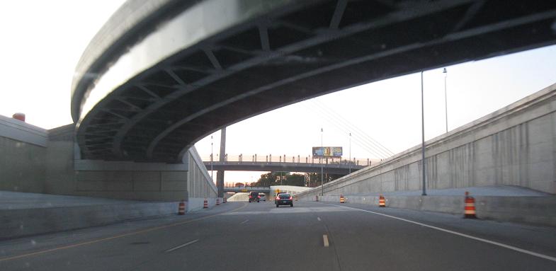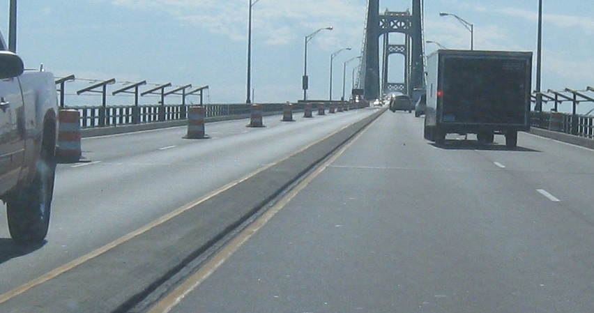 Starting southward across the bridge, with a median that's clearly not up to Interstate snuff. (I imagine it's designed to allow emergency vehicles quick access to the other side, but it can also lead to more incidents requiring emergency vehicles in the first place.) The center of the bridge has an innovative drainage solution that does something I've never seen before: turn a raised median into another part of the steel grate. It's still completely not a median, but it's unique.