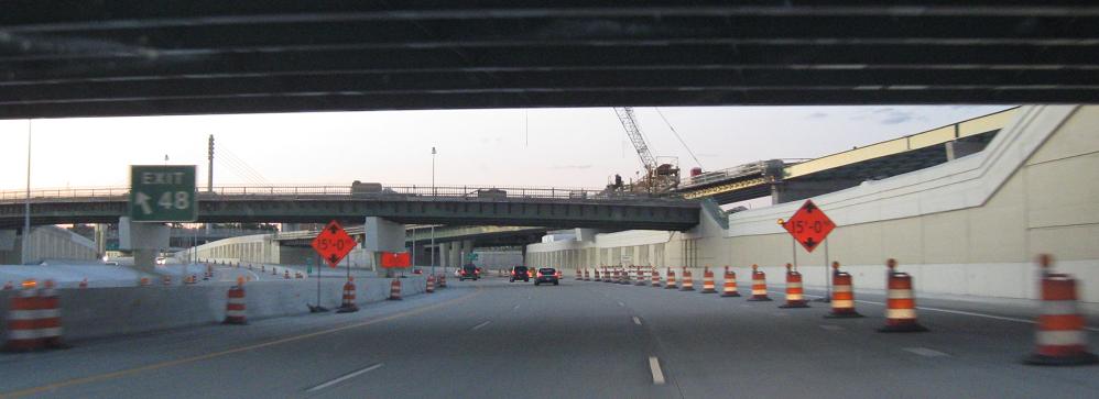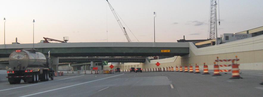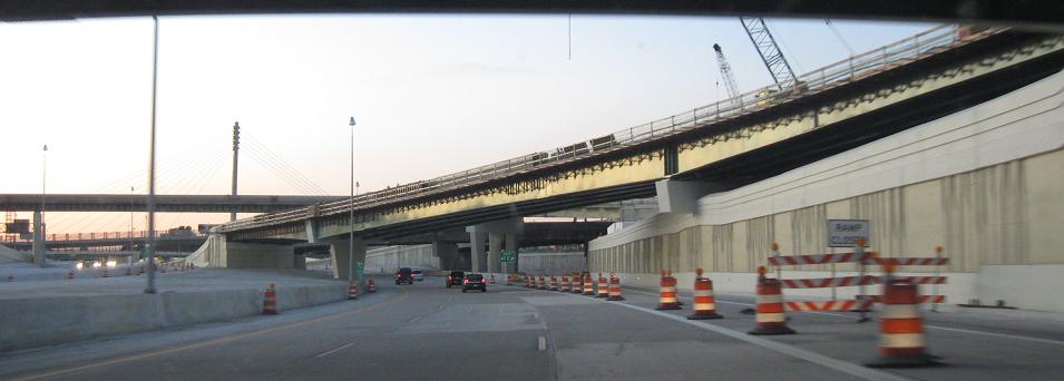 Construction at the US entrance to the Ambassador Bridge to Canada. The ultimate goal of construction is to directly connect I-75 to the bridge instead of mixing with local traffic, but although all the ramps were already completed at this point, piles of dirt sat on them to prevent them from being used and still do at this point. The problem is that MDOT does not want to open the ramps until more of the work on the bridge side is complete, while the bridge owners (a private company) filed suit to force the ramps to open and make travel to and from Canada easier as soon as possible (via their bridge). The subtext is that MDOT wants to construct a new crossing to the south, while the bridge company wants to widen their own existing crossing to keep the money coming in. In fact, part of the US approach to the twinned bridge was constructed already without authorization and certainly without buy-in from MDOT (see the linked page in this caption). So as much as the Ambassador Bridge direct connection is up in the air, the capacity improvement situation is that much worse.