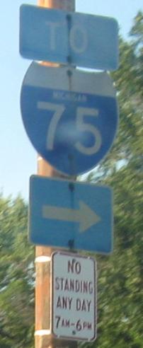 Livernois Ave. NB at M-102. The wide M- shield here is more than compensated by the very old, notched-font I-75 shield from before the FHWA standardized highway fonts across the country. (Every standalone state-name Interstate shield I saw in the Detroit area appears to date to the mid-1970s or earlier.)