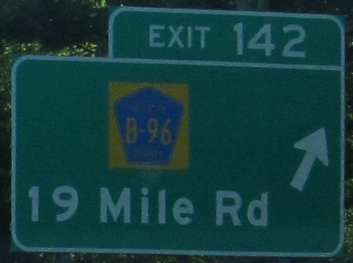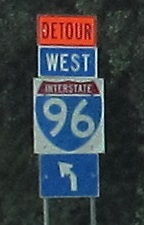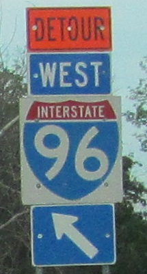 A few years later, construction moves to I-96. I-296 NB follows the non-cutout shields and the ugly gore sign to a long ramp to I-96 WB.