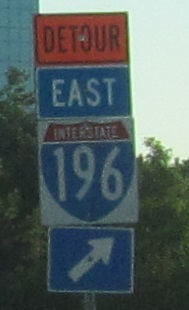 I'm confused. The narrow shield is at Exit 86A, which is actually I-196 and therefore not a detour. The wider shield is just past there and makes more sense with requiring a detour.