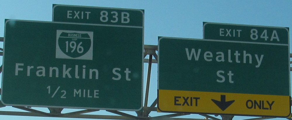 Unusual business route signs on opposite ends of downtown Grand Rapids. The second one is NB.