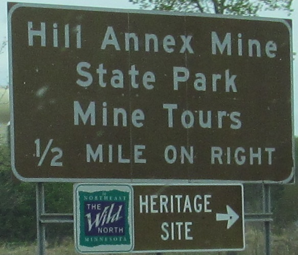 NB and 2 SB signs at Gary St. in Calumet, CR 84. The large sign is helpful to explain which state park can be reached, but a bit unnecessarily wordy. "Mine Tours" and "on right" are unnecessary.