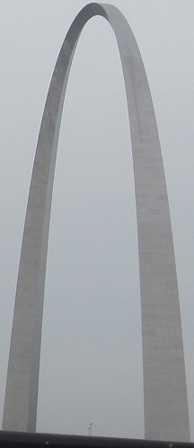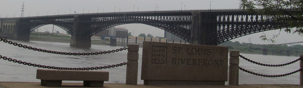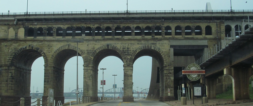 For a different perspective, I travel EB on the stub of Washington Ave. east of Memorial Dr., down the south side of Eads Bridge. From here, I can see inside the abutments to the MetroLink station within; the trains run as a subway through downtown and come out on the far side of the bridge.