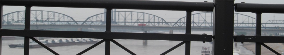 Looking north at the parallel Martin Luther King [sic; no "Jr."] Bridge as I cross the Eads Bridge into Illinois, briefly part of US 66. The last photo is a railroad-crossing truss from the central MLK Bridge lanes nearing I-55/I-64/IL 3; the outer lanes were added later to eliminate weaving from the inside MLK Bridge merge (or exit) to the I-64 split and I-70 junction, and have no interesting superstructure.