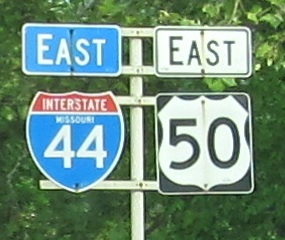 US 50 joins at Exit 247 and old US 66 joins again at Exit 261. However, there's a short, cut-off old alignment of 66 just to the north across the Meramec River, easily accessible from I-44/US 50 on both sides. Other than that bridge in Route 66 State Park, stay on the EB Interstate until MO 366 to follow US 66.