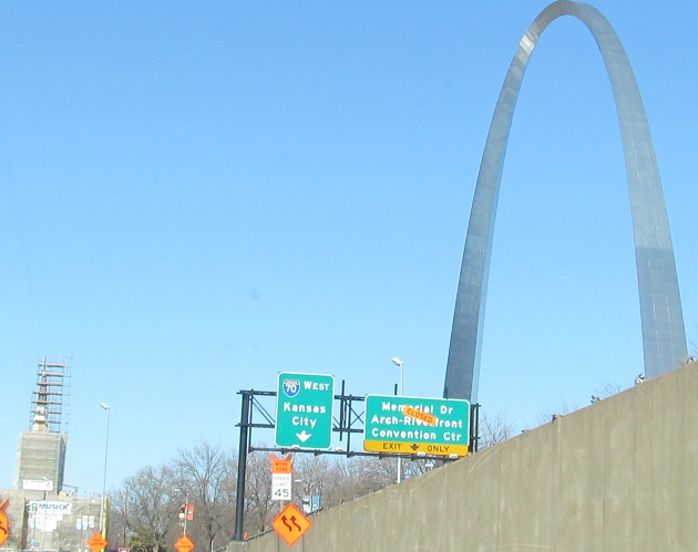 EB and WB views of the Arch on former I-70, one heading north from the Poplar St. Bridge and the other south from the new Stan Musial Bridge. Since I-44 leads straight into I-70 WB, the onramp sign isn't wrong, but it was more right pre-Stan.