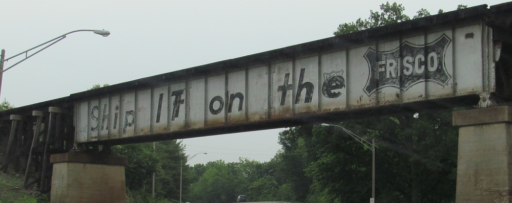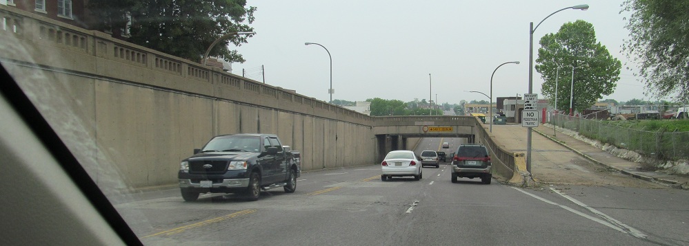 Under the Missouri Pacific RR (now part of Union Pacific, but don't change the sign please) just east of Meramec St., with U-turn overpasses on either side to serve a few houses.