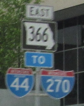 Soon after MO 366 begins, it hits a split in the route where Bypass US 66 was designated just three years after MO 366 was custom-built as US 66. It makes no sense that US 50 WB is also to the left, when by taking it down MO 366 WB it would get to I-44 more quickly for its multiplex.