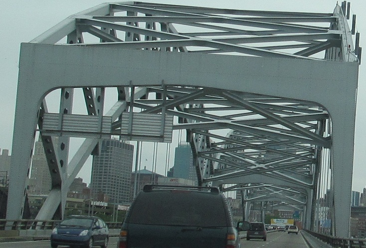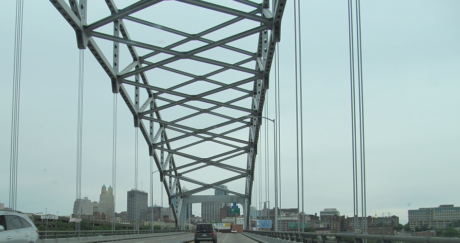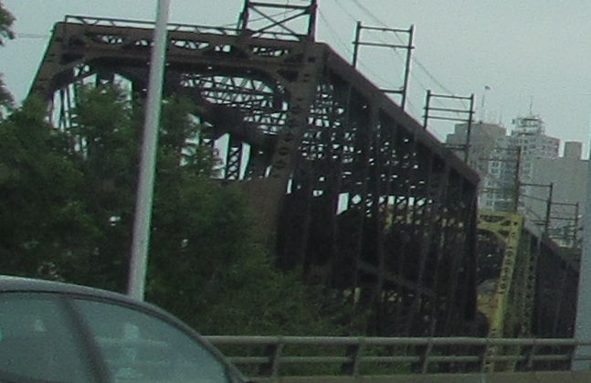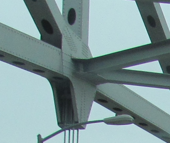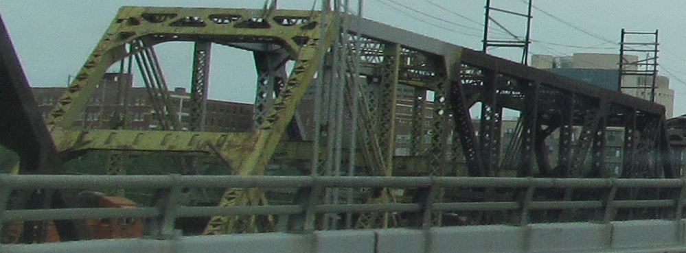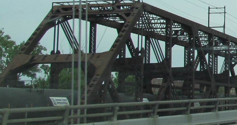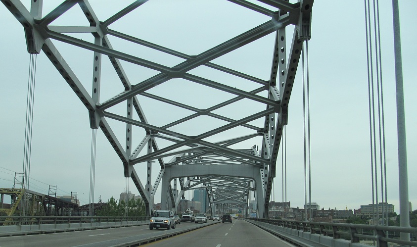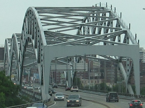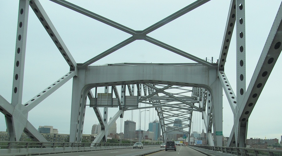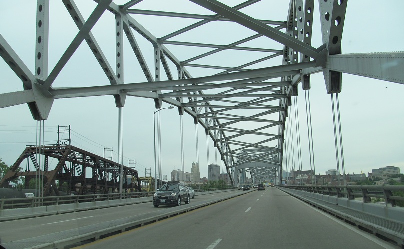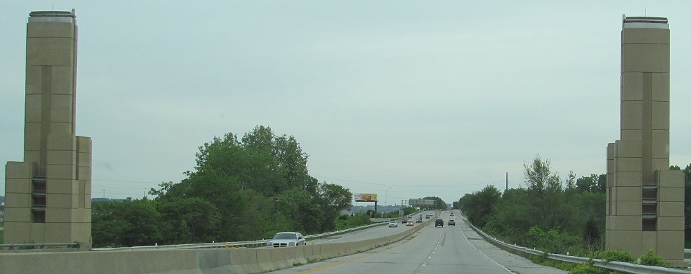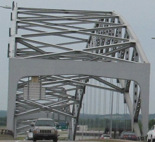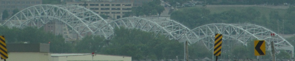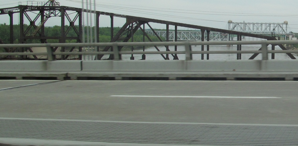 The unique arches of the Broadway Bridge and, less spectacularly, the unique median and shoulder gratings, heading across the Missouri River to downtown Kansas City, and then a look to the east at the Second Hannibal Bridge (that's a city, not a cannibal) in the foreground and another two bridges in the background. Both pairs of bridges have a very unusual feature in common - the railroad trusses once had upper decks carrying vehicular traffic, that were later removed when the wider parallel spans were built. Also, both rail spans open for river traffic, while both roadway bridges are fixed. The main difference is that while the Hannibal Bridge is a swing span, the ASB Bridge behind it is a lift span. The ASB Bridge and the green one just behind it are featured on the MO 9 page, linked below, where I share some more neat information that'll blow your structurally minded... mind.