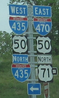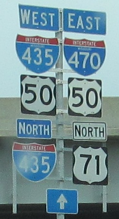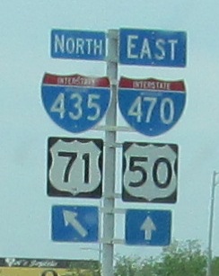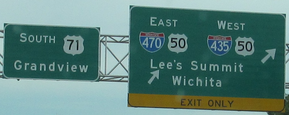 Red Bridge Rd. EB at Exit 182, just south of the Grandview Triangle, then turning to head onto US 71 NB (or any of the other interchanging routes). The last assembly omits the necessary information that I-435/US 50 WB are also straight ahead.