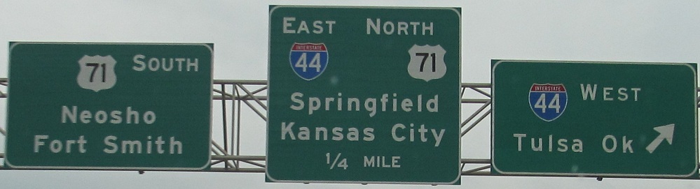 The end of MO 249 SB in Joplin; the extra BGS space is for I-49, coming within a year of when I took the photo (April 2012). If we go to Tulsa, is that Ok?
