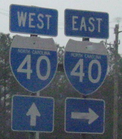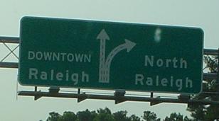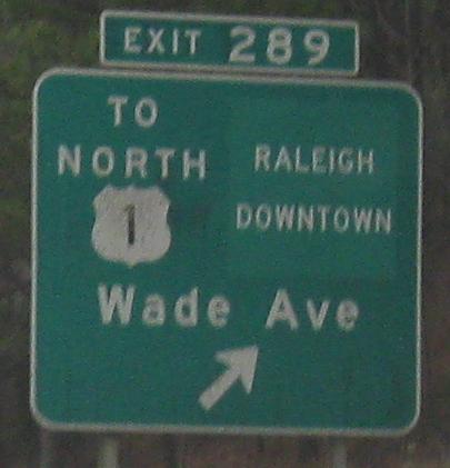 Old BGS eastbound at Wade Ave., dating to before I-40 lived on to Wilmington. I-40 goes straight, and Wade Ave. is to the right. Really, though, downtown is also best reached via Wade, as the WB sign above tried to direct you.