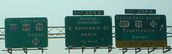 Older freeway signage from I-40/US 64. At Exit 298, both "A" and "B" directions carry all three routes, but when the sign was made they all got onto the Beltline here and nothing went into Raleigh. "Garner" was patched over "S Saunders St" because the FHWA now prohibits mixing street names and destinations on guide signs.
