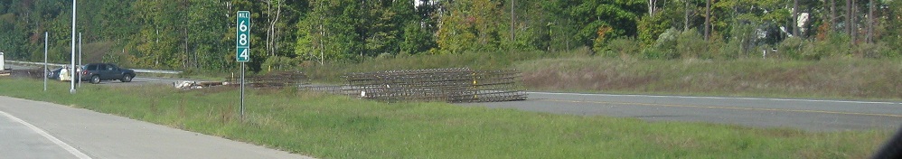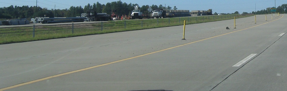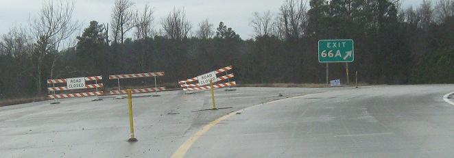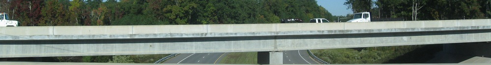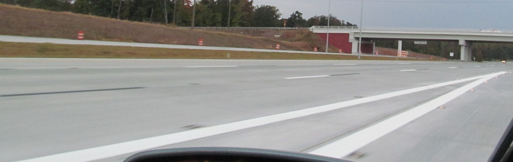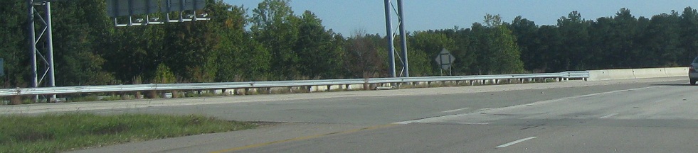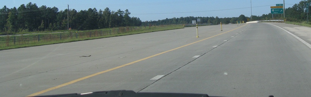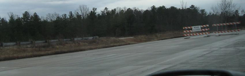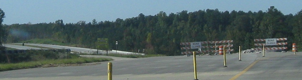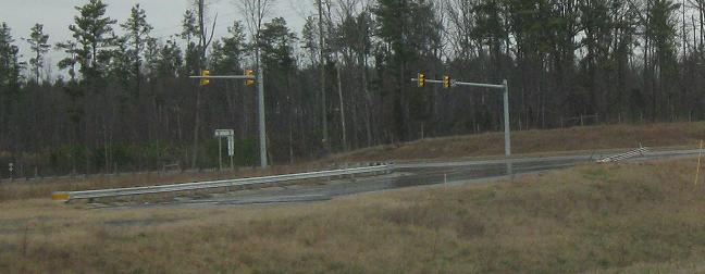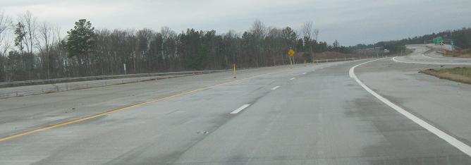 The westbound end of NC 540, in 2009 before anything was built of the future southward extension. NC 540 is just a placeholder until the Outer Loop extends to a major route so that I-540 can extend with it. Ultimately, the entire loop around Raleigh will be I-540, at which point it really should get the even number designation of 640. Also, this part of the loop will then be N-S instead of E-W. The configuration between Exits 67 and 66 will have three through lanes, with two lanes added at 67 and dropped at 66. Those three lanes look quite wide when there are no stripes on them. Unlike most stubs around the country, NCDOT likes to trim them to immediately after the last interchange ramp (or first in the other direction).