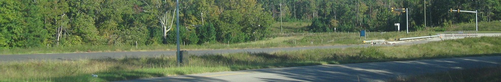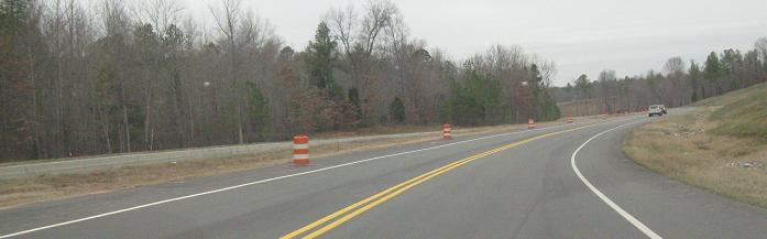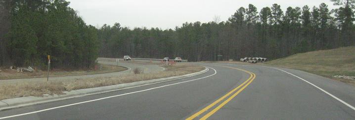 Davis Dr. NB approaching NC 540 Exit 67 in 2009, affording a glimpse of the Raleigh area's road construction policy. As the city's development extends farther out, more two-lane arterials are built. Right-of-way is preserved so that as traffic volumes warrant, the road can be widened to the standard four divided lanes or five (with two-way center left-turn lane) undivided lanes. In some cases, each developer is responsible for widening the adjacent road, so you end up with patchwork roads that constantly flare out and back. In this case, NCDOT is widening SR 1613 on its own.