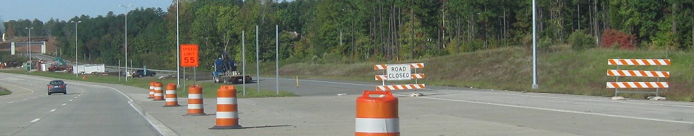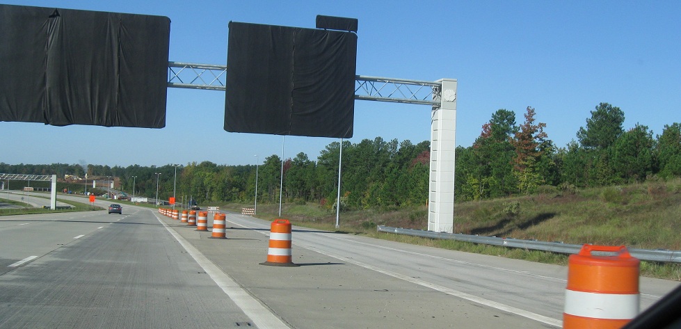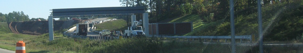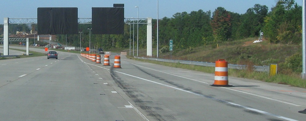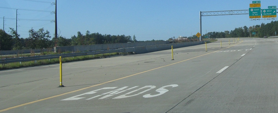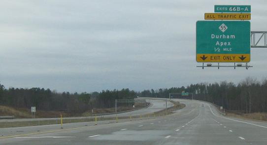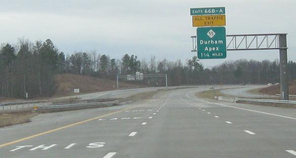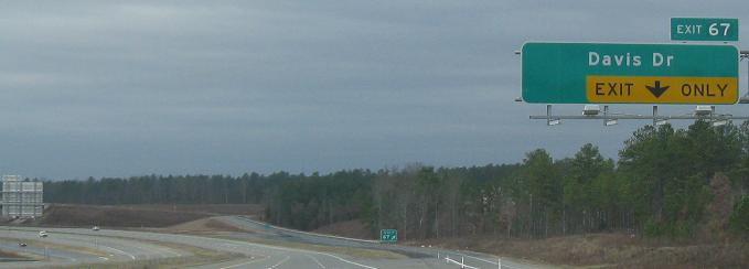 NB, formerly EB, through Exit 67/NC 147/Triangle Expressway toll road construction in 2011, with one of the new ramp tolls already installed for All-Electronic Tolling (AET: no booths, just bills in the mail). Davis Drive lost its connection to NC 540 as a result of the new interchange.