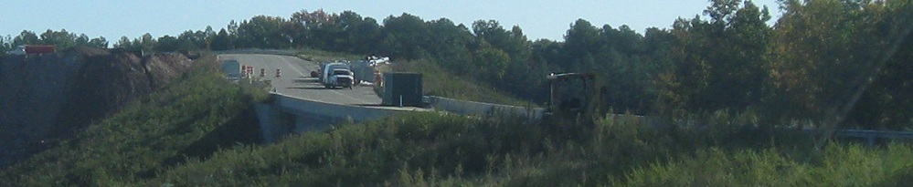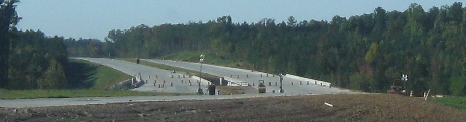 NC 540 WB through the Exit 67 interchange, with some of everything in 2009: stub ramp (WB to the tollway), ghost bridge (NC 540 EB onramp from Kit Creek Rd. over the future tollway), and plenty of clearing (looking south toward McCrimmon Pkwy.).