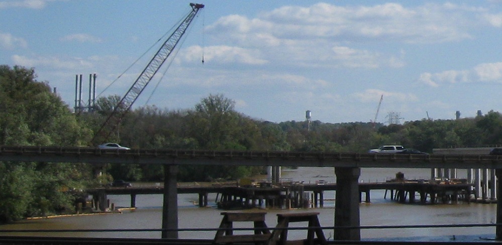 In the immediate foreground, there's a rail truss to the east of the highway. Behind that, I-85 traffic is still on the original Interstate bridge in both directions, but the new NB bridge is under construction to the east. In 2012, traffic was shifted over to that new bridge, NB followed by SB, the old bridge was demolished, and construction then began on the future SB bridge. I-95 may be the famous corridor up north, but the business of the South is done along I-85.