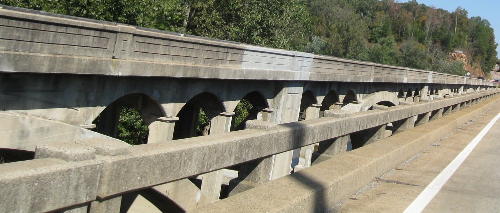 I couldn't get Lou's angle on the arches, but here is the 2011 condition where both directions of US 29/70/NC 150 are on the newer NB bridge, with the SB one temporarily closed. One would think that an old concrete arch bridge has probably outlived its useful lifespan, but 2013 aerial imagery shows the NB bridge completely gone (!) and traffic getting through on the old bridge to old 29/70 (Old Salisbury Rd.). (I-85 construction has closed Exit 83 for the time being.) The NB/EB routes join I-85 NB in the distance.