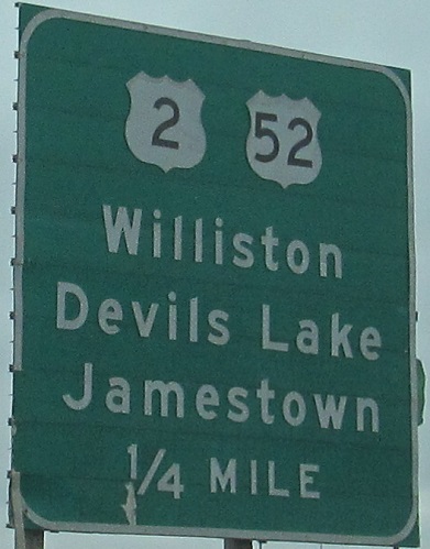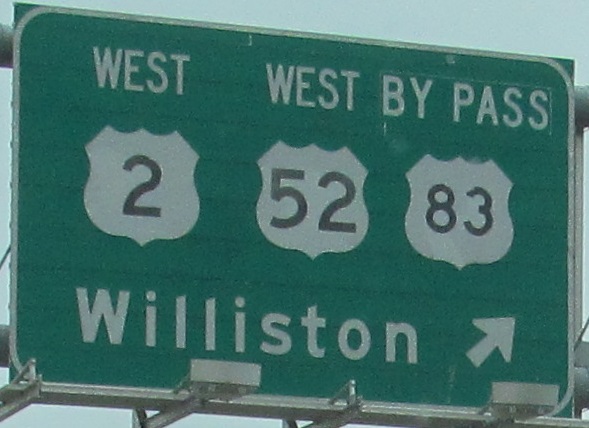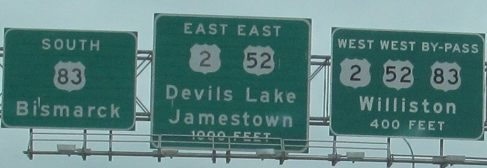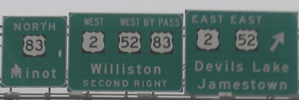 These NB signs must be pretty old to feature black shield backgrounds. "BY PASS" is a greenout over something, but with US 83 going straight through Minot, I can't figure out what. ("NORTH" is not a greenout, or else I might have implicated a business route.)
