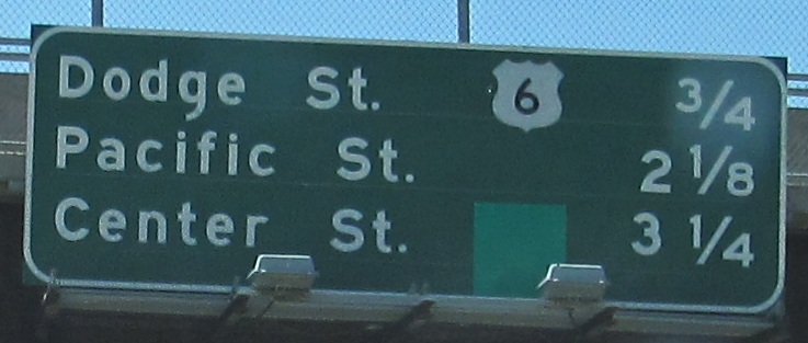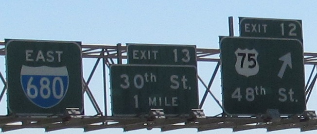 A similar WB/SB run, ending at what should be Exit 0, except Nebraska always signs 3-digit Interstate ends by the exit number on the intersecting parent route (I-180, I-480, I-680). At least in this direction, Exit 13 should be signed for US 75 South, which is just a left turn off the exit ramp and going straight for a block. Note the missing wagon from the bottom of the first NE 133 shield (presumably a replacement for the original).
